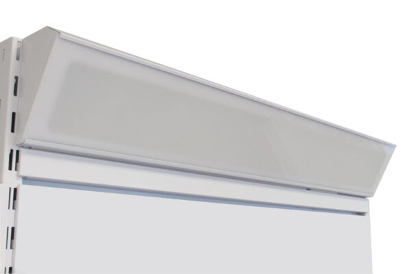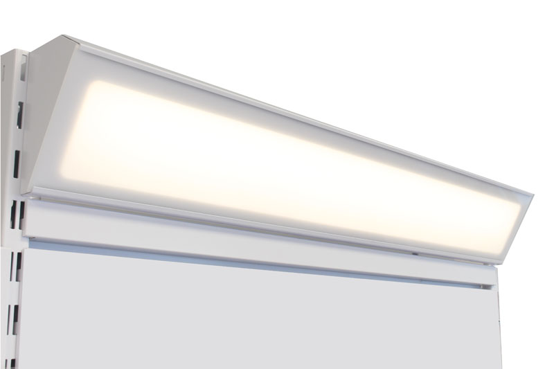 Világítással is szerelhető döntött reklámfelület bolti polcokhoz
